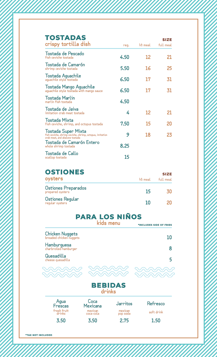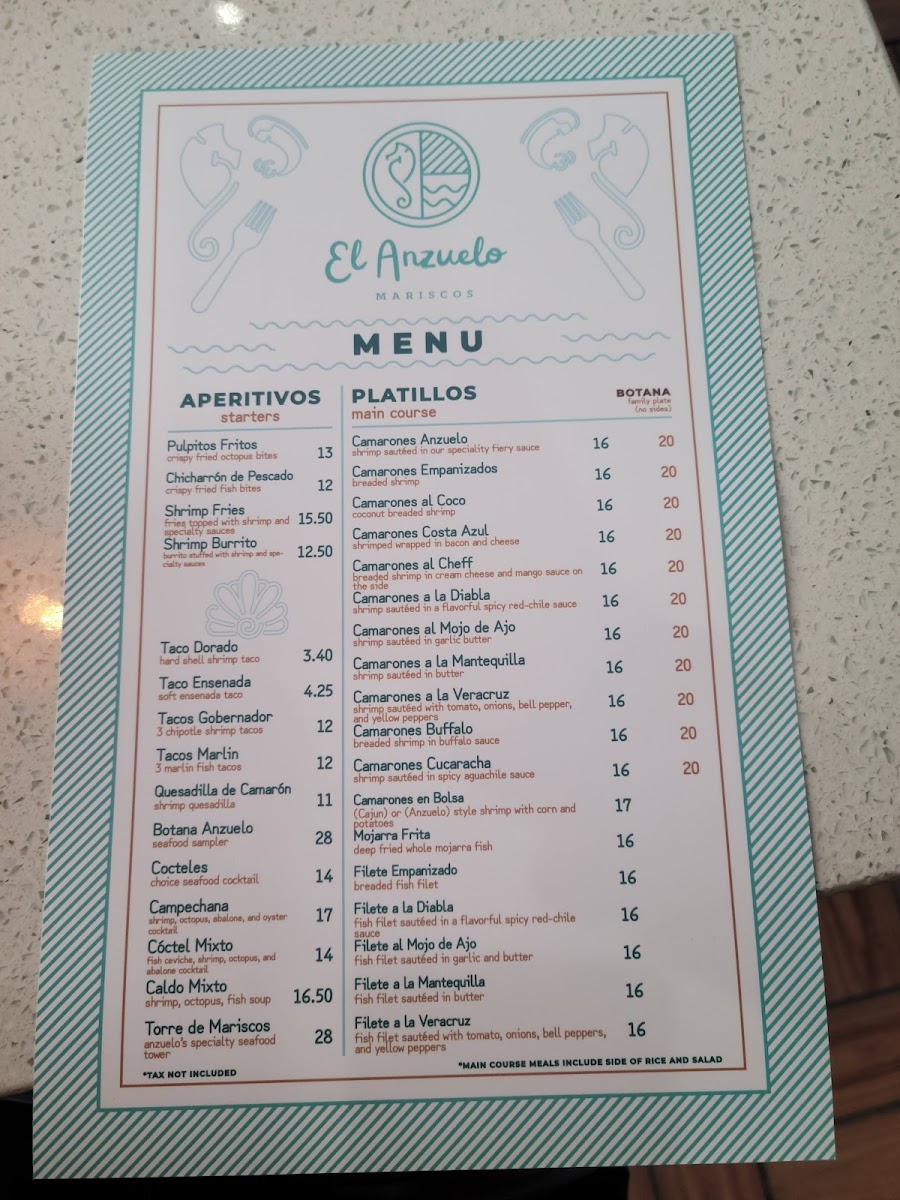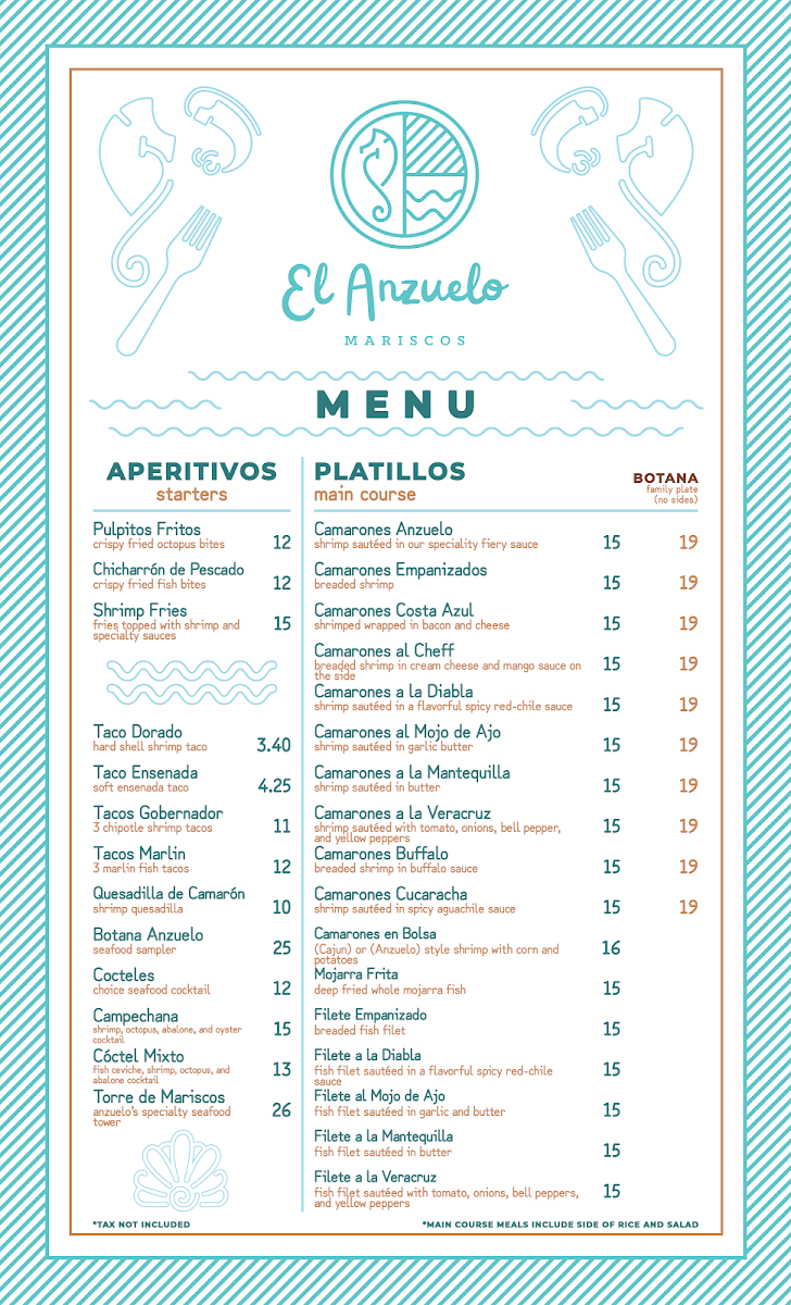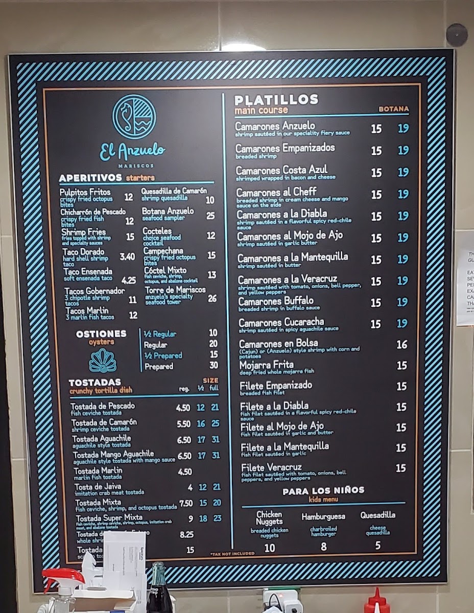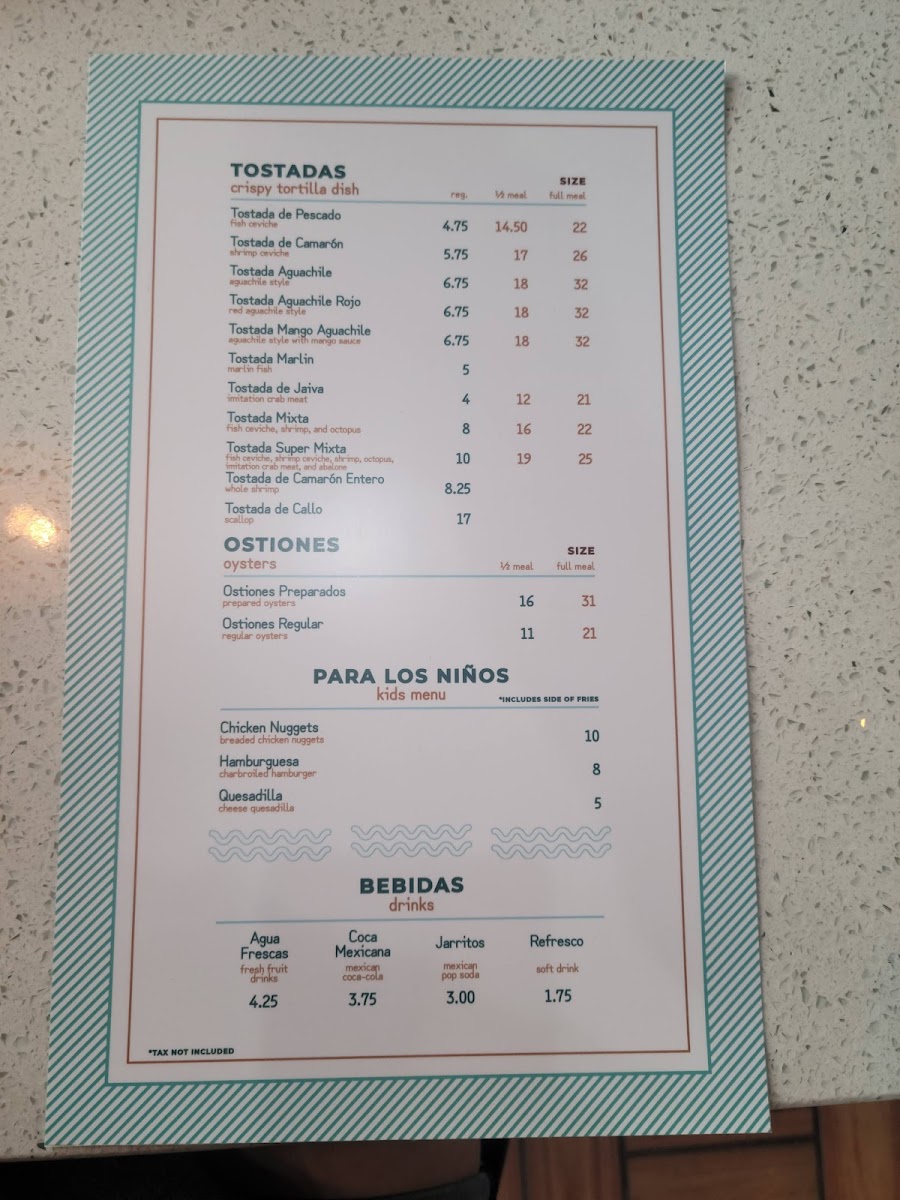 The menu at Mariscos El Anzuelo offers a wide range of fresh and flavorful seafood dishes, making it a great spot for seafood lovers. For a light start, their Tostada De Callo and Tostada Mango Aguachile provide a refreshing burst of flavor, while the Tostada De Pulpo and Tostada De Jaiva showcase the richness of octopus and crab. If you're in the mood for something more substantial, the Camarones De La Casa and Camarones Al Coco are excellent choices, with the latter offering a delightful sweet and savory combination. For a crispy treat, the Filete Empanizado and Mojarra Frita are perfect for those seeking a crunchy texture. The Cocteles, such as the Campechana and Coctel De Pulpo, feature generous portions of seafood served in a flavorful broth, while the Sopas like the Caldo Mixto and Ramen De Camaron provide comforting options for colder days. If you’re looking for quick snacks, the Pulpitos Fritos and Taquitos De Pollo are popular appetizers, alongside the crispy Chicharrón De Pescado. Families with kids will enjoy options like the Hamburger and Chicken Nuggets. For something unique, the Ostiones Preparados and Tacos Gobernador offer a taste of the coastal culinary scene. To wash it all down, you can try one of their refreshing Coca Mexicana or Agua Frescas, or go for something more festive like Sangria. If you’re in the mood for a hearty meal, the Botana Anzuelo and Torre De Mariscos will satisfy your craving for seafood variety. All in all, Mariscos El Anzuelo offers a vibrant and diverse menu that caters to all tastes, ensuring that each visit is a flavorful experience.